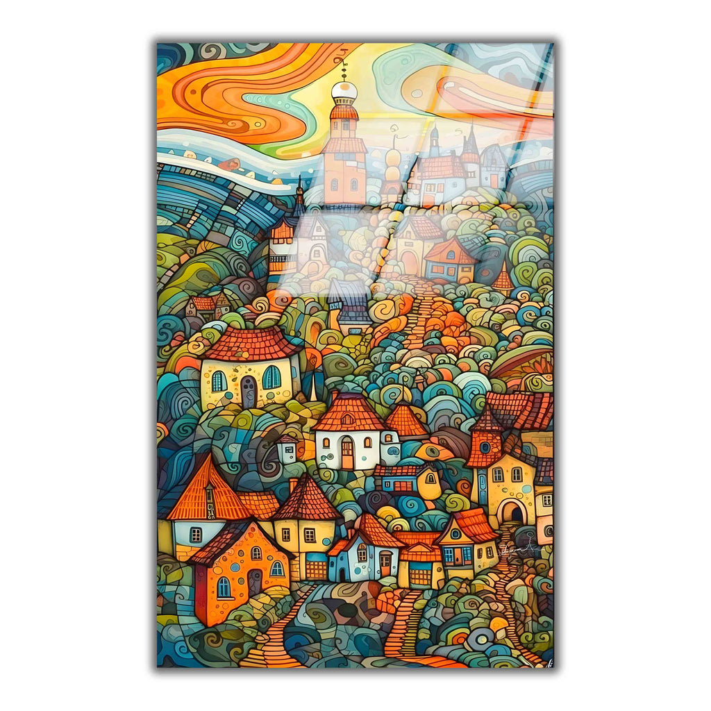 Glowing Homesteads Vertical Glass Wall Art - Tempered Glass Rectangular Wall Decor