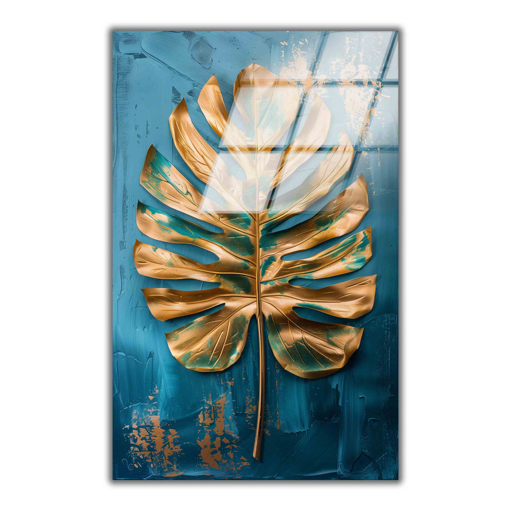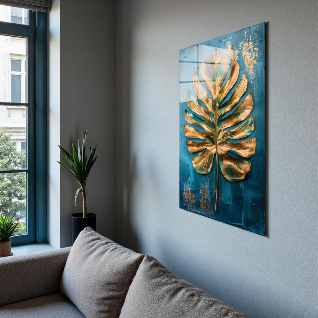 Golden Frond Vertical Glass Wall Art - Tempered Glass Rectangular Wall Decor