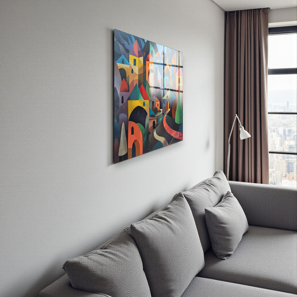 Village Square Tempered Glass Wall Art - Abstract Design - Large Glass Decor for Living Room & Office