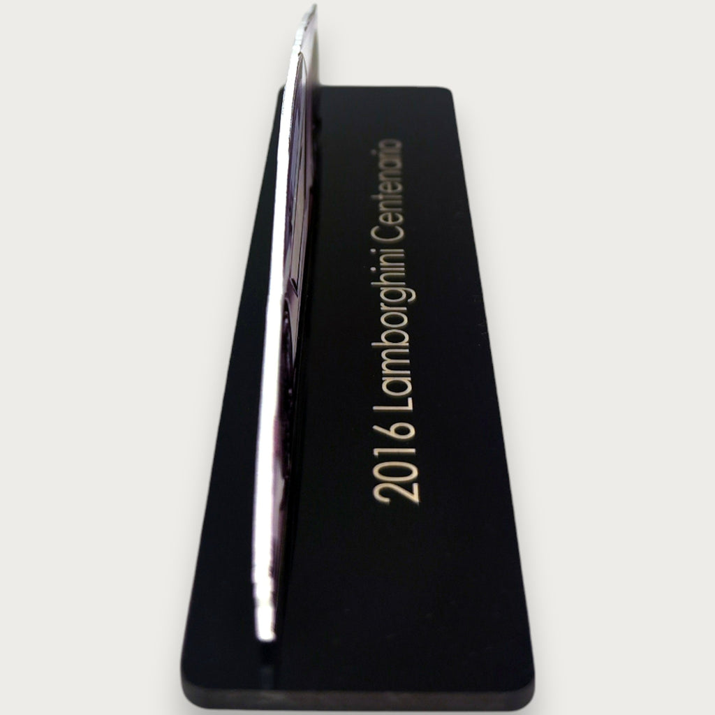 Our table top model Metal part is 15cm (5.9”) and black plexi base is 17cm (6.7”) Made of 2 mm metal, our models have a sleek black base of 3 mm piano black plexi with the brand and model name elegantly displayed. Our Wall Decor Models (30cm 11,8”|50cm 19,7”|70cm 27,5”|110cm 43,3”) do not have a black plexi base. The metal is finished with glossy electrostatic powder and UV digital printing for a vibrant and flashy look.