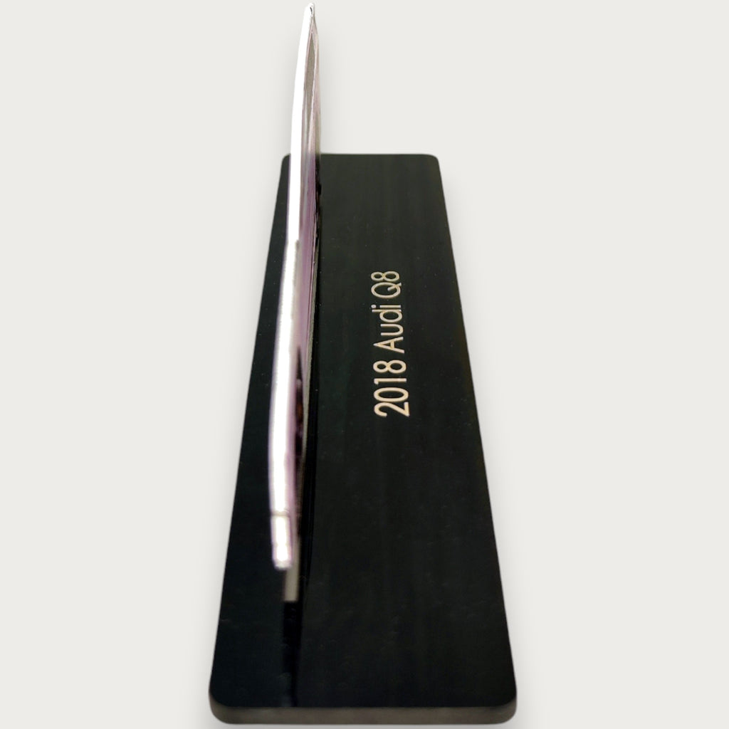 Our table top model Metal part is 15cm (5.9”) and black plexi base is 17cm (6.7”) Made of 2 mm metal, our models have a sleek black base of 3 mm piano black plexi with the brand and model name elegantly displayed. Our Wall Decor Models (30cm 11,8”|50cm 19,7”|70cm 27,5”|110cm 43,3”) do not have a black plexi base. The metal is finished with glossy electrostatic powder and UV digital printing for a vibrant and flashy look.